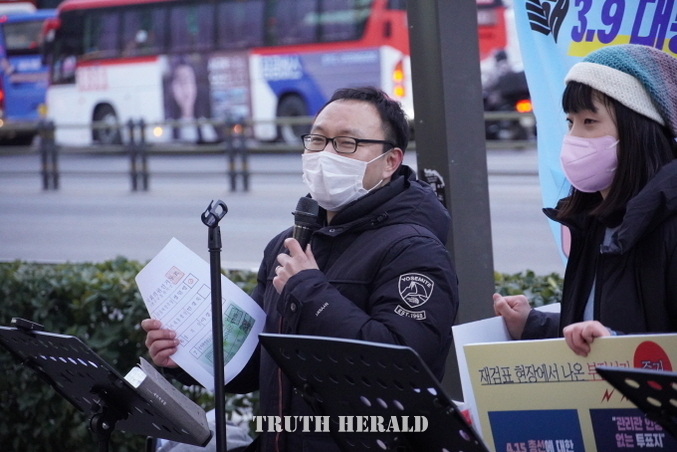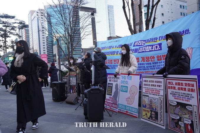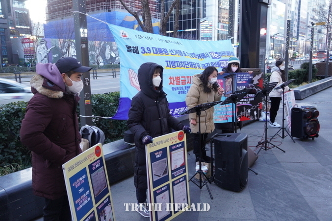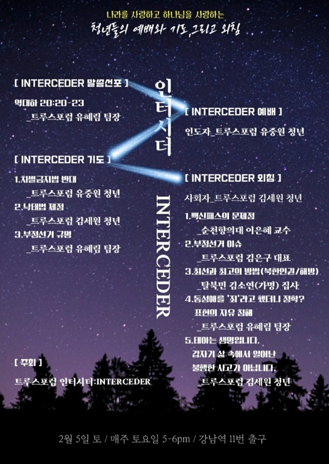 트루스포럼 인터시더(Interceder)팀은 토요일 오후 5시마다 서울 강남역 11번 출구 앞에서 버스킹 집회를 갖고 있다. 입춘에 몰아친 매서운 추위에도 불구하고 진리의 목소리를 높이기 위한 청년들의 열기를 꺾을 수 없었다.