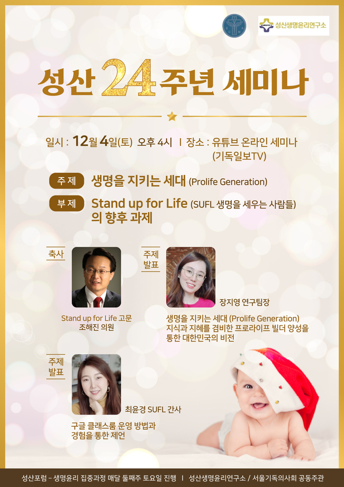 성산생명윤리연구소 창립 24주년을 기념하며 열리는 이번 세미나는 12월 4일 오후 4시 기독일보TV 유튜브 채널을 통해 온라인으로 진행된다.