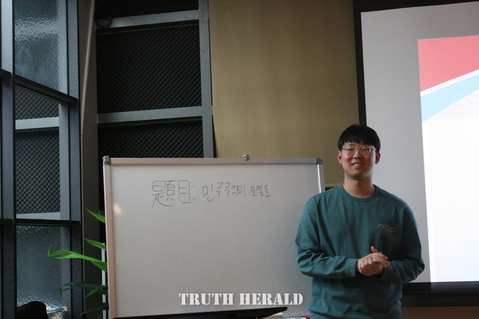당일 트루스텐미닛에선 ‘알이랑 민족’이라는 주제로 고려대 트루스포럼 황예지 자매의 발제와 ‘논쟁적 개념 민주주의 : 여러가지 모델들’ 이라는 주제로 서울대 트루스포럼 전현호 형제의 발제가 진행되었습니다.