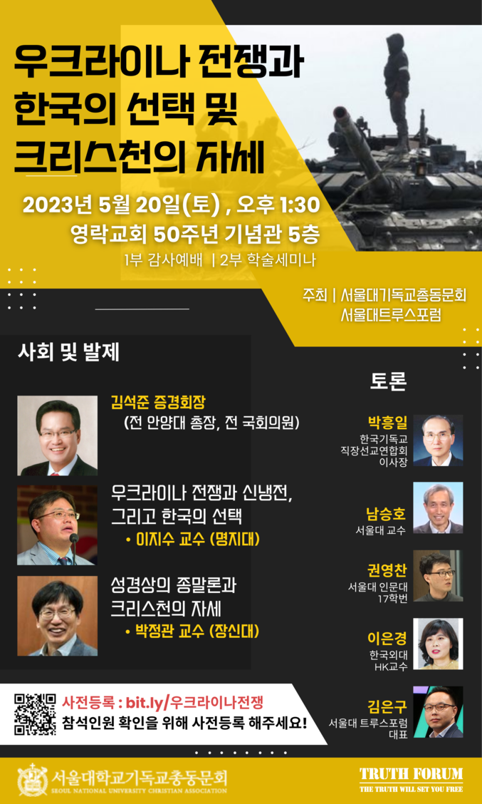 이에 서울대학교기독교총동문회와 서울대트루스포럼은 <우크라이나 전쟁과 한국의 선택 및 크리스천의 자세>라는 제목으로 특별 세미나를 진행합니다.