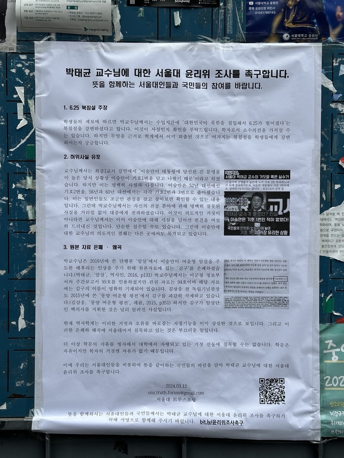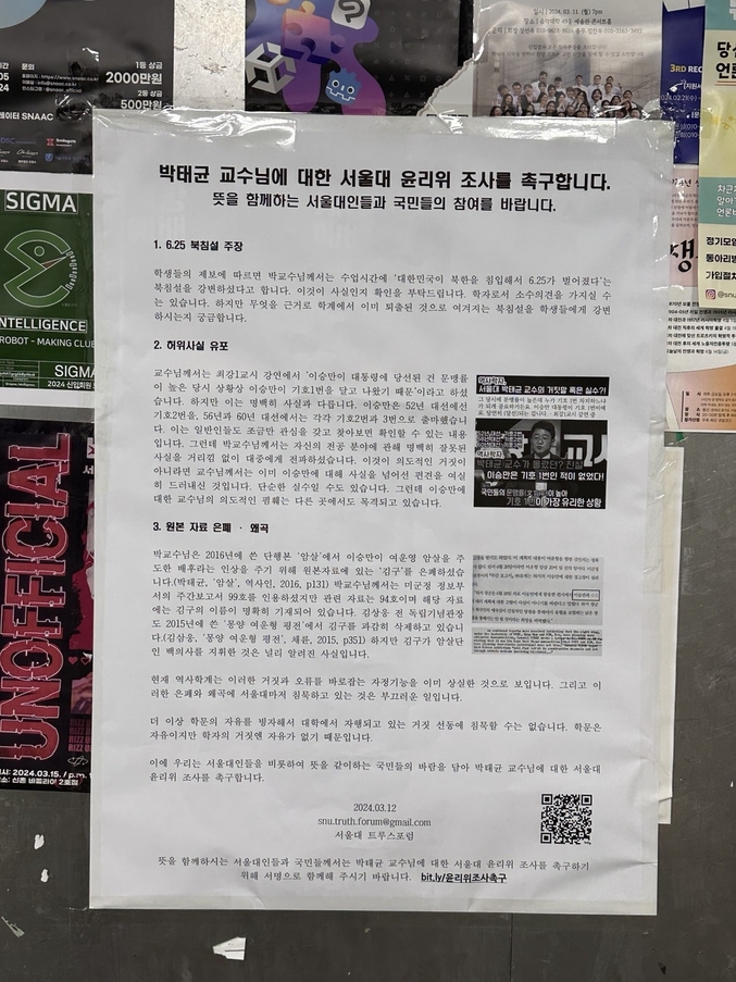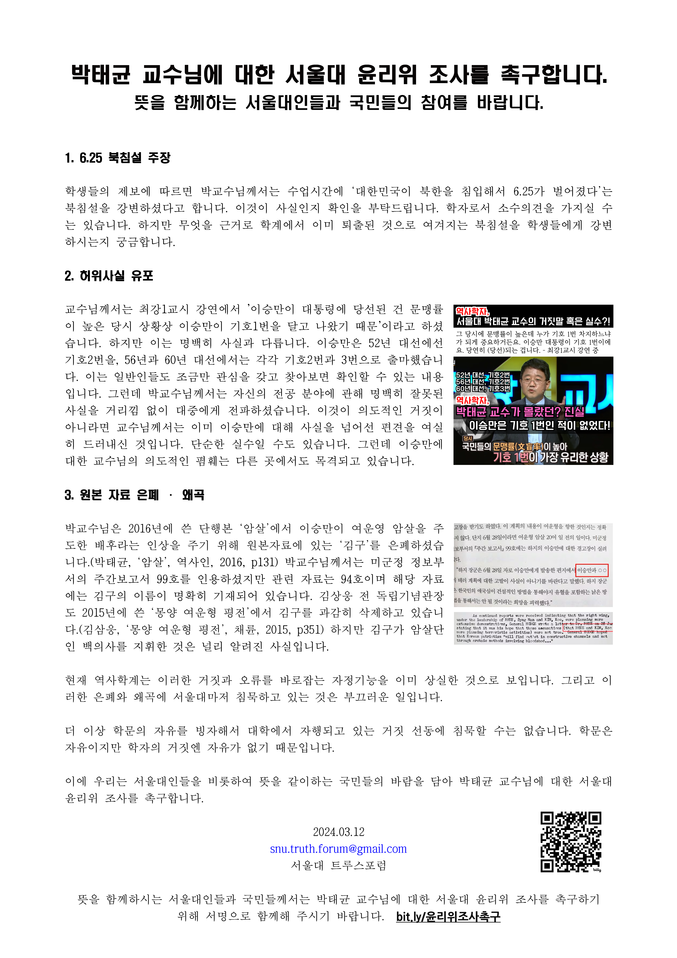 이에 우리는 서울대인들을 비롯하여 뜻을 같이하는 국민들의 바람을 담아 박태균 교수님에 대한 서울대 윤리위 조사를 촉구합니다.