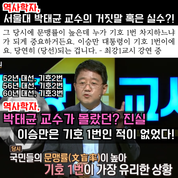 교수님께서는 최강1교시 강연에서 '이승만이 대통령에 당선된 건 문맹률이 높은 당시 상황상 이승만이 기호1번을 달고 나왔기 때문'이라고 하셨습니다. 하지만 이는 명백히 사실과 다릅니다. 이승만은 52년 대선에선 기호2번을, 56년과 60년 대선에서는 각각 기호2번과 3번으로 출마했습니다. 이는 일반인들도 조금만 관심을 갖고 찾아보면 확인할 수 있는 내용입니다. 그런데 박교수님께서는 자신의 전공 분야에 관해 명백히 잘못된 사실을 거리낌 없이 대중에게 전파하셨습니다. 이것이 의도적인 거짓이 아니라면 교수님께서는 이미 이승만에 대해 사실을 넘어선 편견을 여실히 드러내신 것입니다. 단순한 실수일 수도 있습니다. 그런데 이승만에 대한 교수님의 의도적인 폄훼는 다른 곳에서도 목격되고 있습니다.