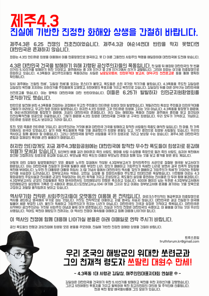 2024년 4.3을 맞이하여 대학생들을 중심으로 이루어진 청년 보수주의 단체 트루스포럼은 “제주 4.3, 진실에 기반한 진정한 화해와 상생을 간절히 바랍니다.” 라는 제목의 대자보를 서울대를 비롯한 전국의 각 대학들에 게시하고 있습니다.