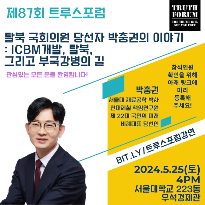 주제 : 탈북 국회의원 당선자 박충권의 이야기: ICBM 개발, 탈북, 그리고 부국강병의 길