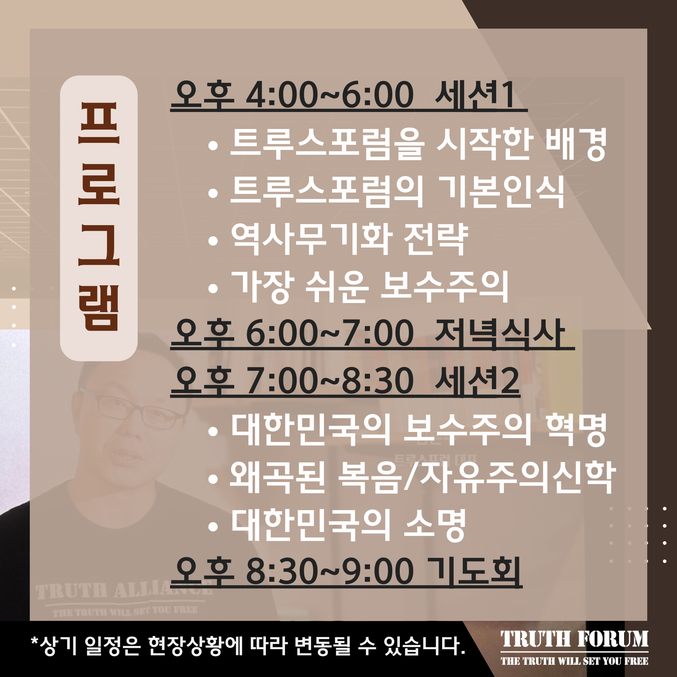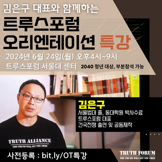트루스포럼 김은구 대표가 직접 진행하는 이번 특강은 트루스포럼의 방향성과 기본인식 그리고 보수주의에 대한 이해를 넓히는 시간입니다.