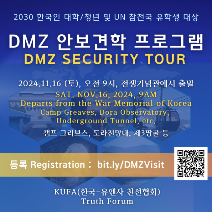 Truth Forum and the Korea-UN Friendship Association (KUFA) warmly invite Korean and international university students to explore the DMZ with us. This tour is a special chance to reflect on the priceless values of freedom and peace, while gaining firsthand insight into the reality of Korea’s division.