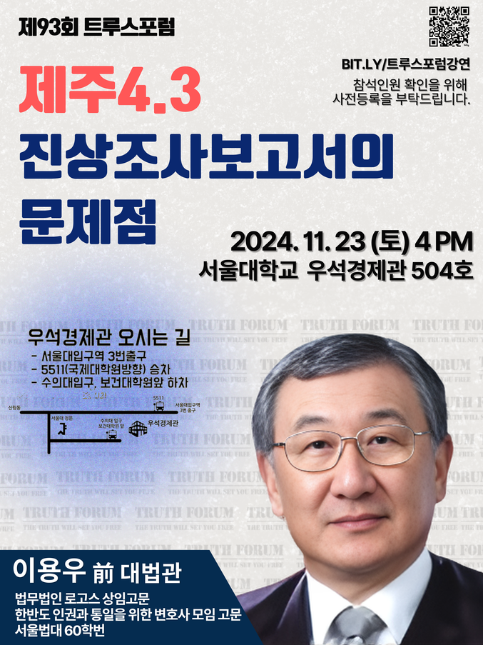 * 강사이신 이용우 前 대법관께서 트루스포럼의 제주4.3대자보를 꼭 읽고 오시기를 부탁하셨습니다. 대자보 전문을 아래에 공유합니다.