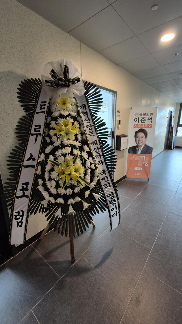 트루스포럼(대표 김은구)은 13일 국회의원 전국 지역구 사무실에 대통령 탄핵을 막을 것과 민주당의 해산을 요구하는 화환과 조화를 발송했다고 밝혔다.