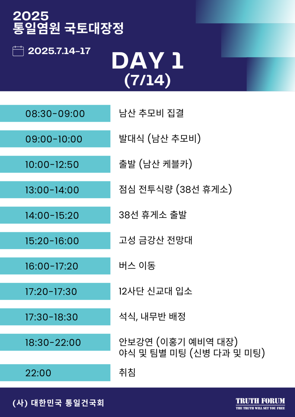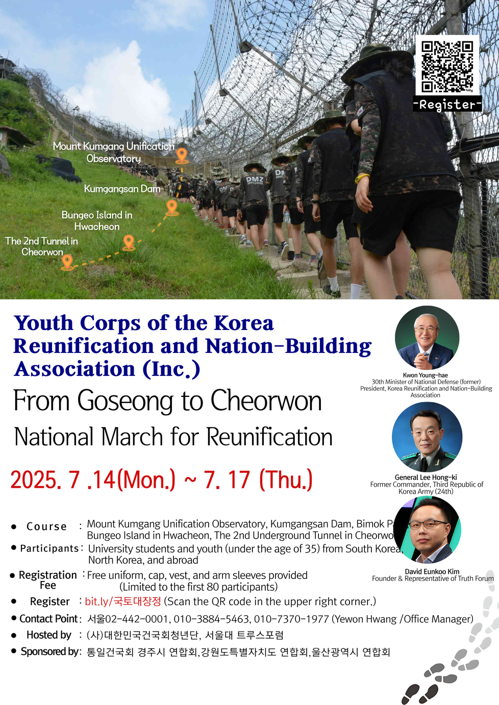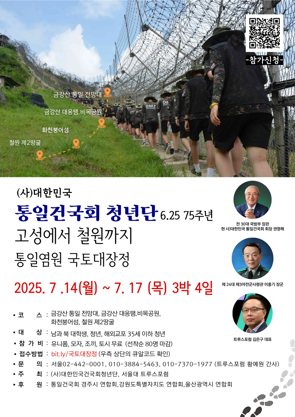 통일건국회와 트루스포럼이 '통일염원 국토대장정' 프로그램을 진행합니다. 7월 14일(월)부터 7월 17일(목)까지 진행되는 이번 행사에 2040 청년들의 참여를 환영합니다. 고등학생도 함께할 수 있습니다.