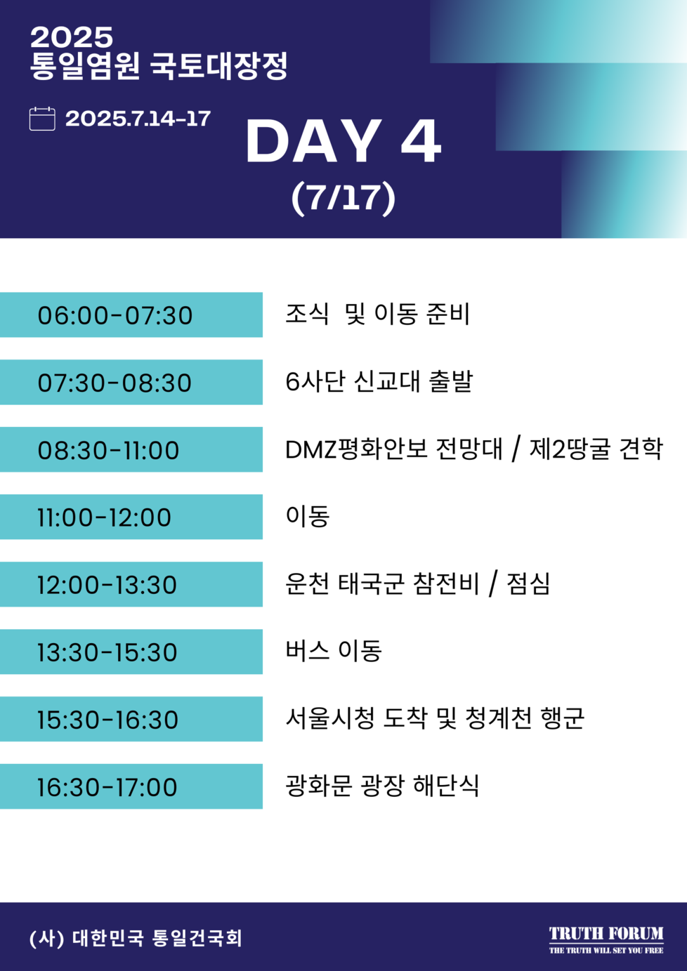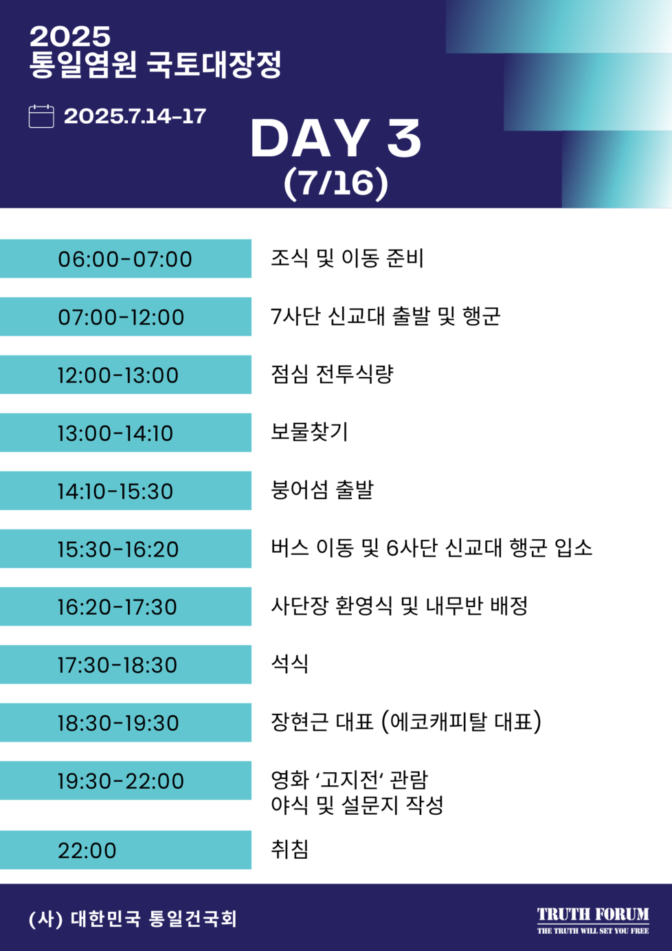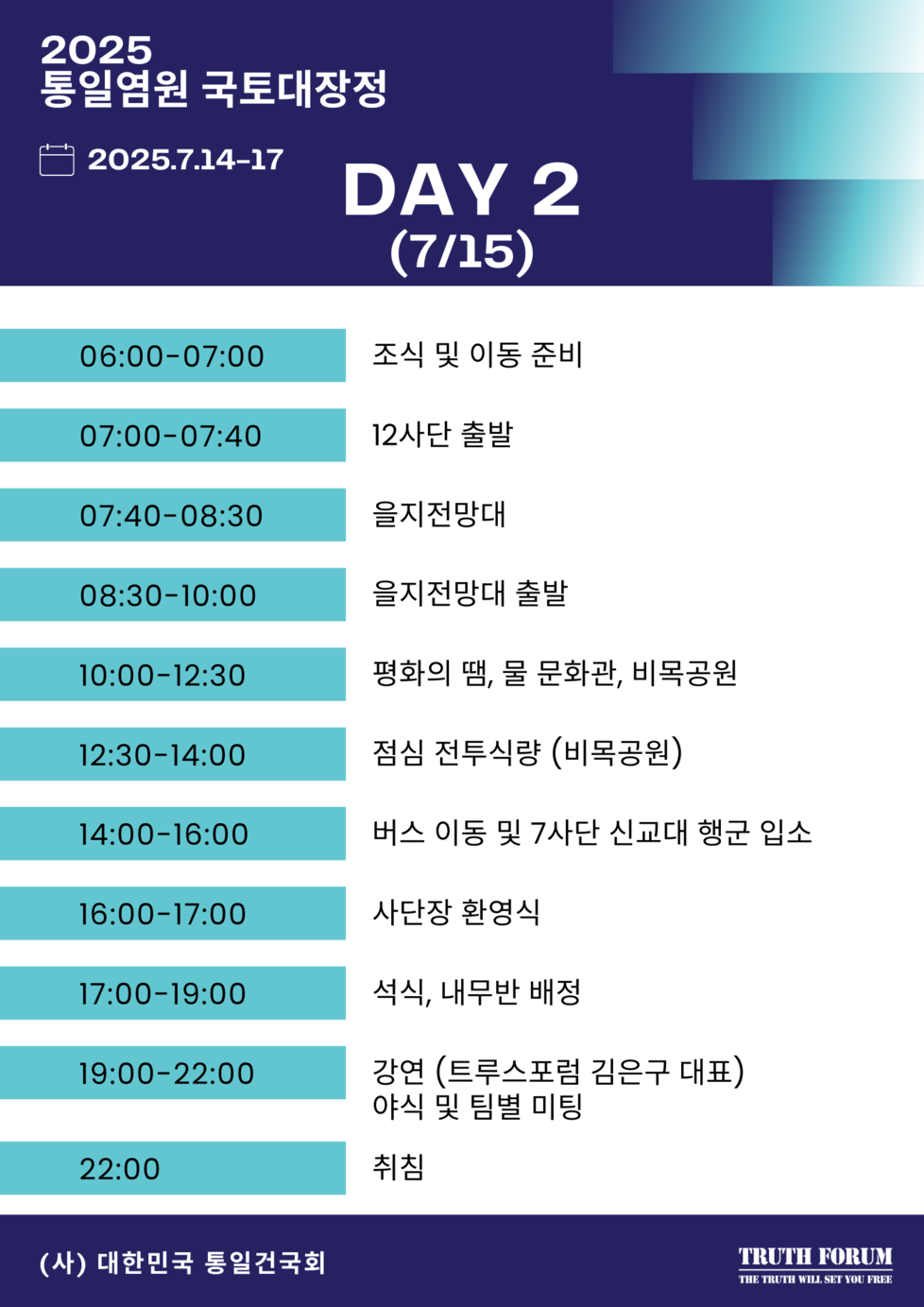 통일건국회와 트루스포럼이 '통일염원 국토대장정' 프로그램을 진행합니다. 7월 14일(월)부터 7월 17일(목)까지 진행되는 이번 행사에 2040 청년들의 참여를 환영합니다. 고등학생도 함께할 수 있습니다.