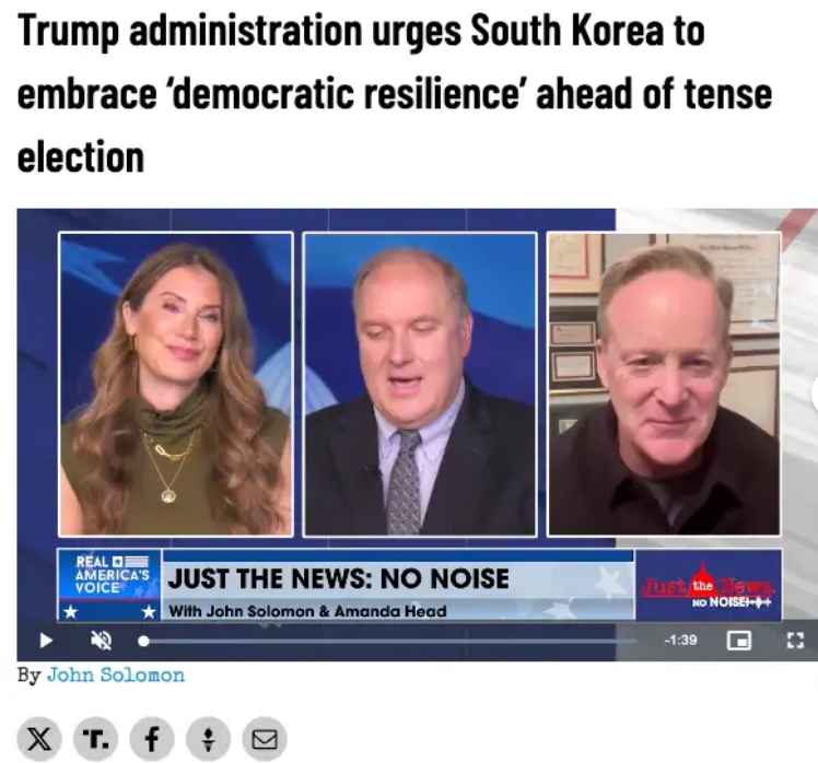트럼프 행정부는 극심한 정치적 혼란 속에서 치러지는 대한민국의 대통령 선거를 앞두고, 한국 국민들이 그들의 “민주주의 회복력”이라는 역사를 되새기길 촉구했다.