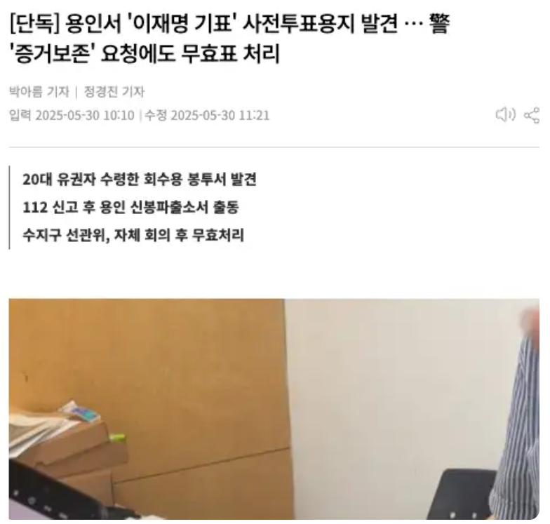 이재명으로 이미 기표된 사전투표용지가 투표인에게 제공됐다. 경찰에 신고했고 경찰은 증거보존을 요청했다. 하지만 선관위는 경찰관을 배제한체 해당 표를 무효표 처리했다.