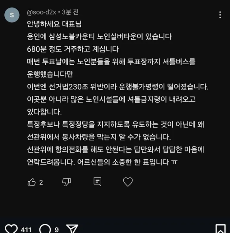 이미 부정선거다. 선관위의 자의적인 유권해석. 거동 불편한 어르신들 투표장 편하게 가시도록 하는게 금품의 제공인가!