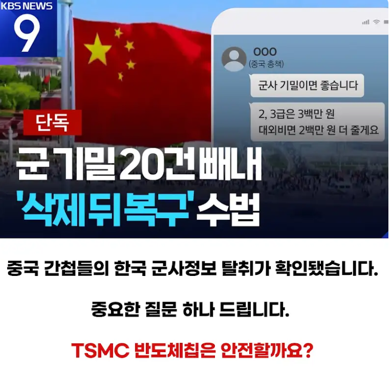중국 간첩들이 대한민국 군사기밀을 빼돌린 수법이 드러났다. 인원들을 포섭하고 금전적인 대가를 주면서 수위를 높여나갔다. 여기서 한 가지 중요한 사실을 언급할 것이 있다. 대만의 TSMC 반도체칩들은 안전할까? 이미 같은 방식으로 TSMC 반도체칩들의 설계도가 중국공산당에 넘어가 있다는 것이 안보전문가들의 준엄한 경고다. 화웨이칩만 위험한 것이 아니라 TSMC칩도 위험하다면, 이미 모든 것이 사실상 중공의 지배 아래 있는 것이다.
