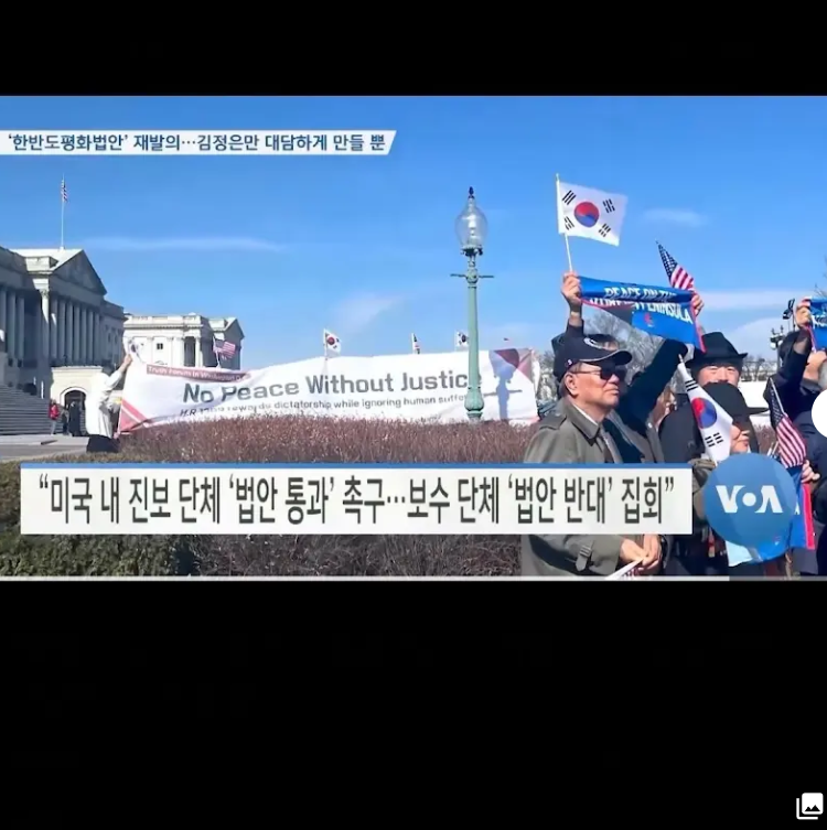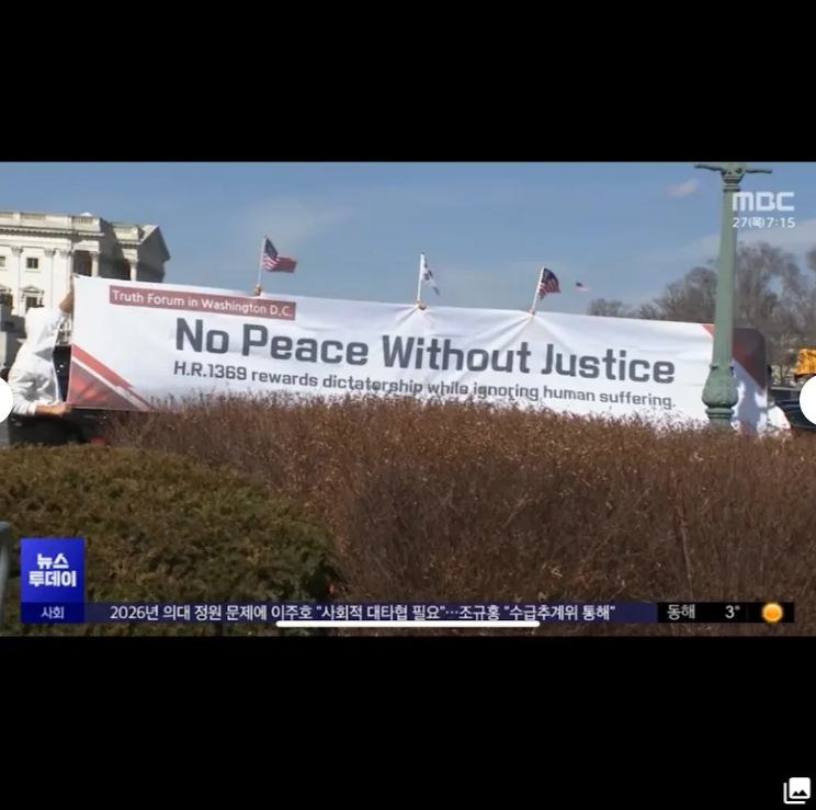 2월 26일, 워싱턴 D.C. 캐피톨 힐에서 브래드 셔먼 의원을 비롯한 33명의 의원이 한반도 평화법안을 재발의하며 종전선언을 촉구하는 기자회견을 열었습니다. 트루스포럼 청년들은 현장에서 ‘No Peace Without Justice’라는 현수막을 들고 법안에 반대하는 입장을 표명했습니다. MBC, VOA에서 보도되었습니다.