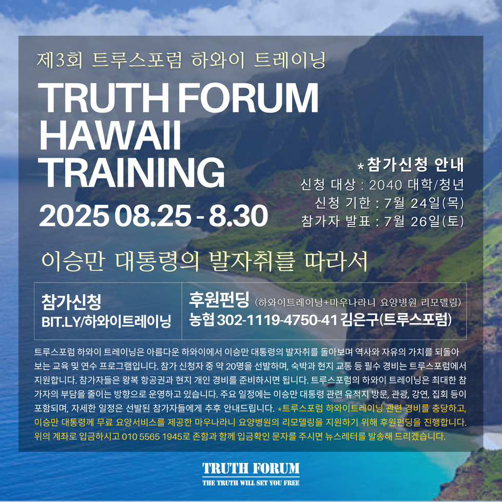제3회 트루스포럼 하와이 트레이닝을 8/25-8/30 진행합니다.