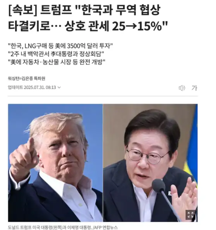 미국이 한국과 전면적이고 완전한 무역 합의에 동의했음을 기쁜 마음으로 발표합니다. 이번 합의에 따라 한국이 미국에 3500억 달러를 투자를 위해 제공할 것입니다. 이는 미국이 소유·통제하며 제가 대통령으로서 직접 (투자처를) 선정할 것입니다. 또한 한국은 1000억 달러 규모의 액화천연가스(LNG), 또는 다른 에너지 제품을 구매할 것입니다. 나아가 한국은 그들의 투자 목적으로 거액을 투자하기로 합의했습니다. 이 총액은 향후 2주 이내에 이재명 한국 대통령이 양자 회담을 위해 백악관에 올 때 발표될 것입니다.