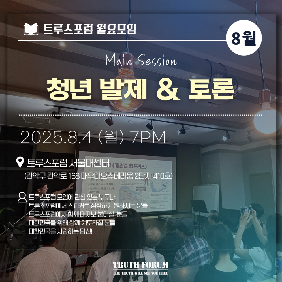 다음 주 월요일인 8월 4일 저녁에도 동일하게 <청년 발제와 토론>으로 트루스포럼 월요모임이 진행됩니다.