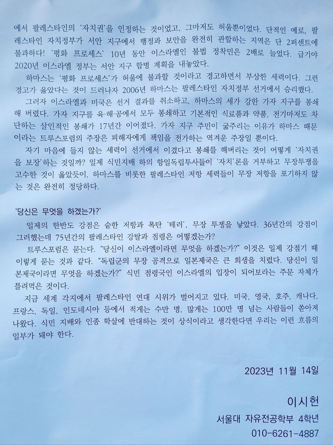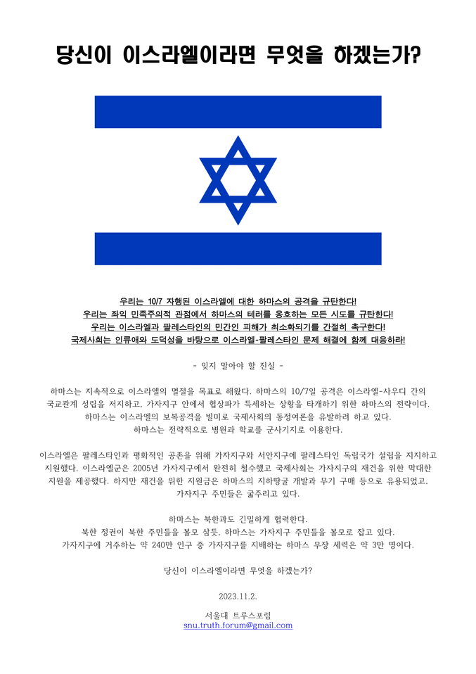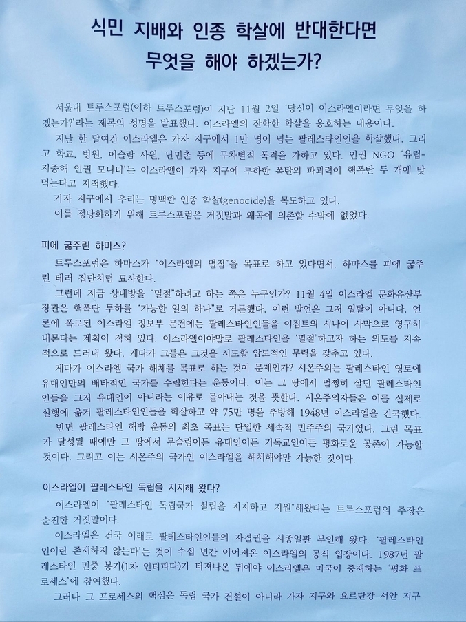 트루스포럼은 지난 11월 2일, 이스라엘을 지지하는 대자보를 서울대에 부착했습니다. 이에 대해 11월 14일, 노동자연대 소속의 서울대 15학번 이시헌씨가 실명으로 반박대자보를 게시했습니다.