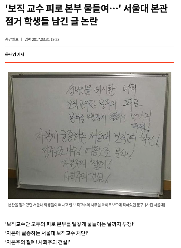 서울대 본부점거 당시 '성낙인을 위시한 너희 보직교수단의 피로 본부를 빨갛게 물들이는 날까지 투쟁! 자본에 굴종하는 서울대 보직교수 처단! 민주노조 사수! 어용노조 분쇄! 자본주의 철폐! 사회주의 건설!'을 외치는 섬뜩한 문구가 본부점거 장소에 적혀 있어서 논란이 되기도 했습니다.