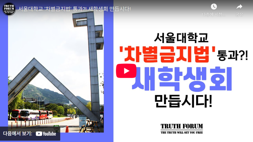 실제로 최근에 학생회관 앞에 인권헌장의 문제점을 지적하고 탈동성애자의 인권을 보호해 달라는 대자보를 붙였는데요, 인권연대국장으로 있는 친구가 일방적으로 대자보에 차단막을 설치하고, '성소수자를 차별하는 대자보 붙이면 처벌 받을 수 있다'는 경고성 발언을 하기도 했습니다. 그동안 트루스포럼이 서울대 안에서 동성애 이슈를 비롯해 다양한 주제에 관해 적극적으로 목소리를 내왔는데요, 이번에 인권헌장 이슈가 학내에서 붉어지면서 트루스포럼과 협력해 온 기독교 동아리를 제명하려는 시도가 진행되기도 했습니다. 이에 관해서는 다음에 독립적인 영상으로 설명을 드리겠습니다.