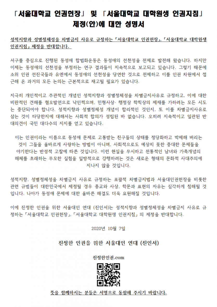 이에 '진정한 인권을 위한 서울대인 연대'(진인서)는 사안의 문제점을 일반에 알리고, 서울대인들과 일반국민들의 반대의견을 관계당국에 전달하기 위해 이 서명을 진행합니다.