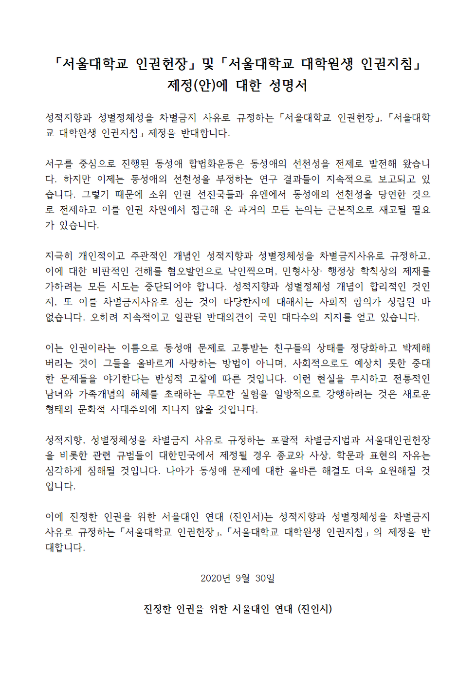 이에 진정한 인권을 위한 서울대인 연대(진인서)는 사안의 문제점을 일반에 알리고, 서울대인들과 일반국민들의 반대의견을 오세정 총장께 전달하기 위해 이 서명을 진행합니다.