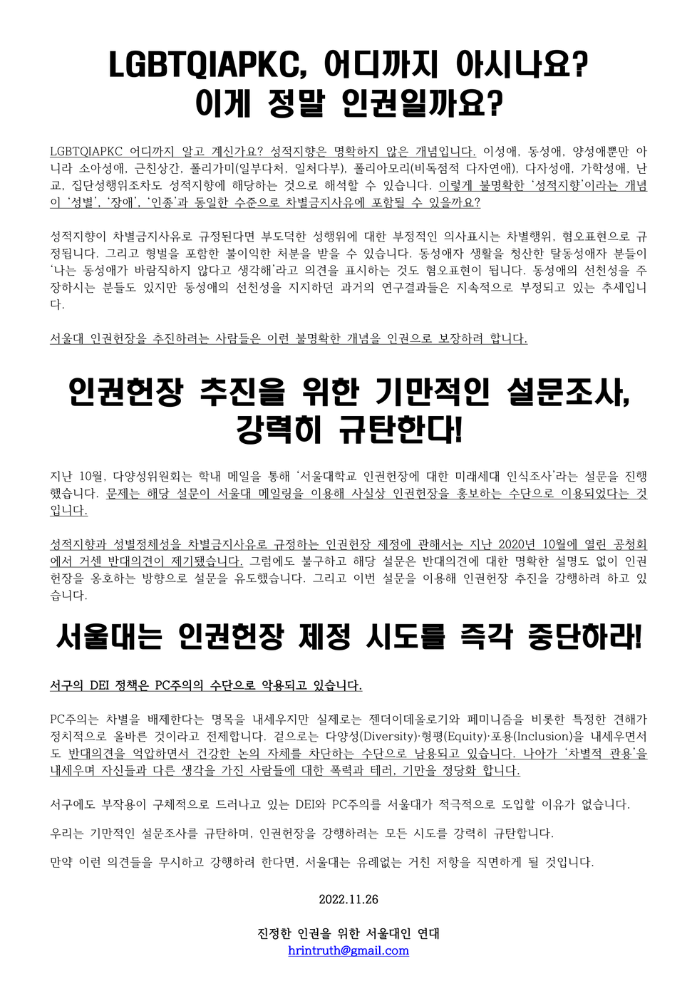 최근 서울대학교 다양성 위원회는 학부생을 대상으로 '서울대 인권헌장에 대한 미래세대 인식조사'를 진행했습니다. 하지만 해당 설문조사는 인권헌장을 사실상 홍보하는 내용이었고, 인권헌장에 대해 제기되고 있는 강력한 반대의견에 대해서는 아무런 설명이 없었습니다. 그렇기 때문에 많은 학부생들이 인권헌장 추진에 대해 긍정적인 의견을 보였습니다.