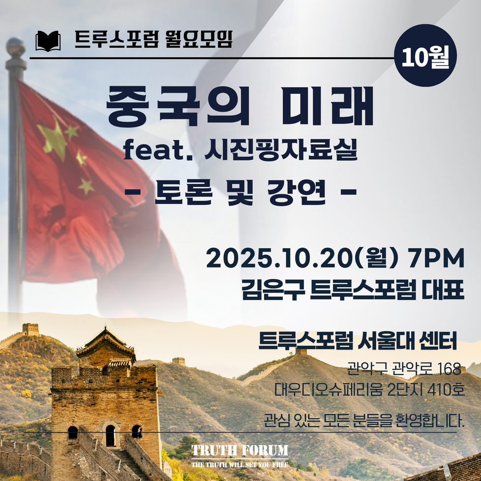 돌아오는 10월 20일 월요모임은 <중국의 미래>를 주제로 트루스포럼 김은구 대표님의 강연이 있습니다.