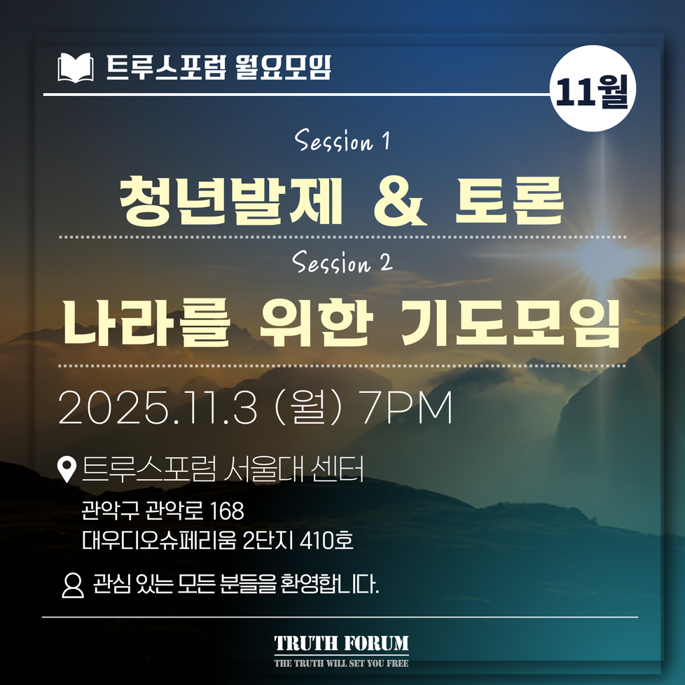 돌아오는 주 월요일(11월 3일) 저녁에는 청년발제와 기도모임으로 진행합니다 :)