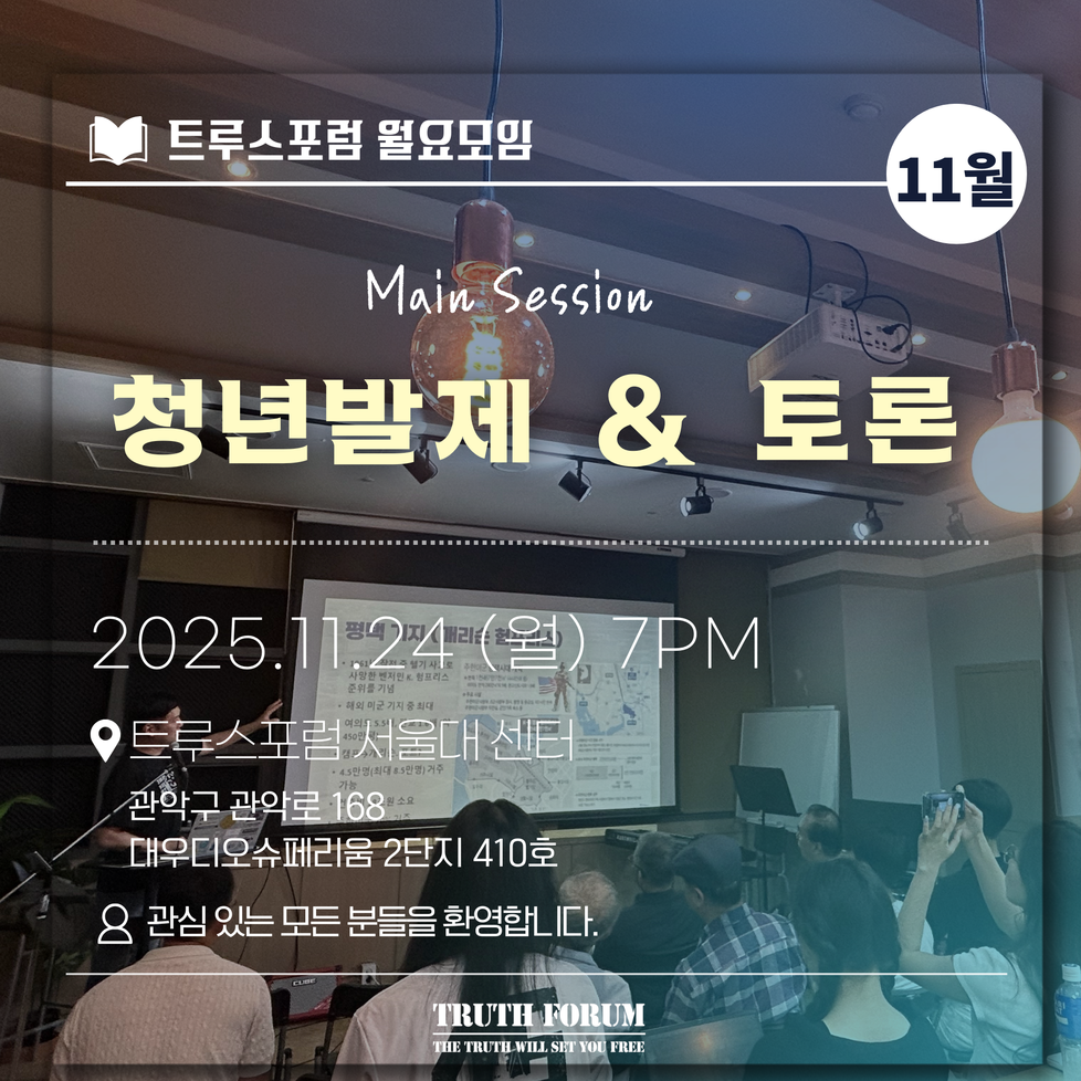 돌아오는 주 월요일 (11월 24일)저녁에는 청년 발제와 토론을 중심으로 트루스포럼 월요모임이 진행됩니다.