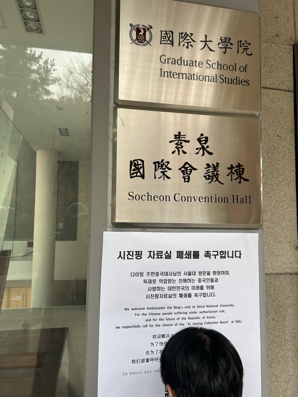 We welcome Ambassador Dai Bing’s visit to Seoul National University.For the Chinese people suffering under authoritarian rule,and for the future of the Republic of Korea,we respectfully call for the closure of the “Xi Jinping Collection Room” at SNU.