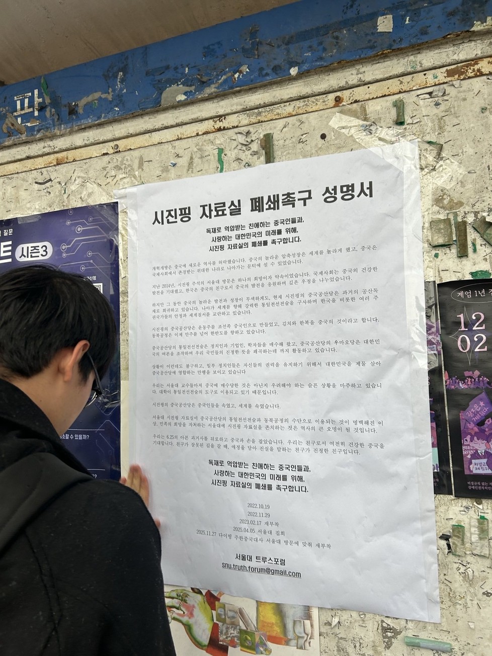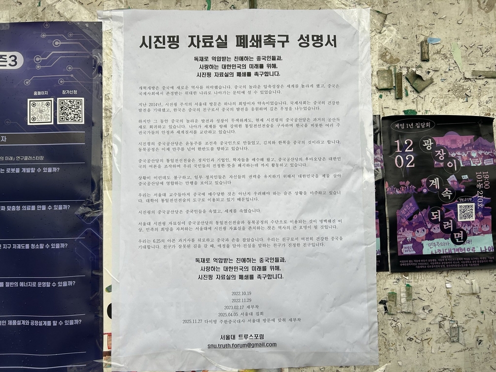 이에 서울대 트루스포럼은 서울대학교 내 국제대학원을 비롯한 주요 건물에 ‘시진핑자료실 폐쇄’를 촉구하는 대자보를 부착했습니다.