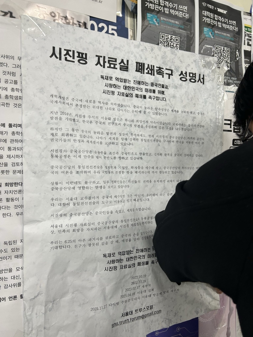 ‘시진핑자료실 폐쇄 촉구' 대자보 부착