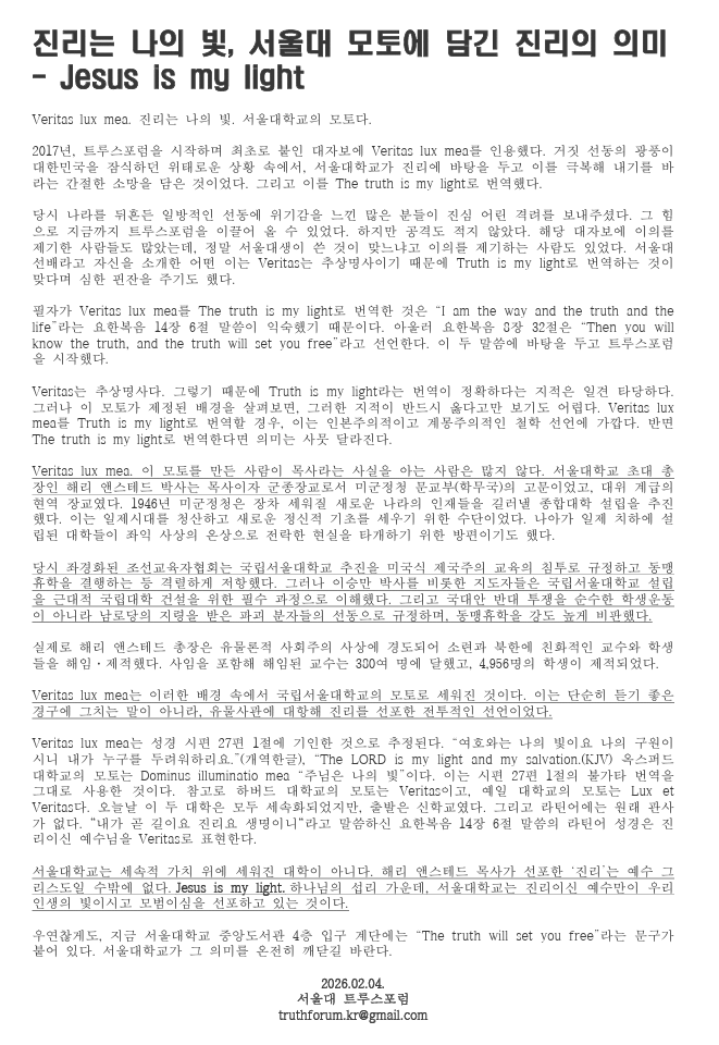 「진리는 나의 빛 – 서울대 모토에 담긴 진리의 의미