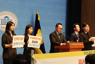 헌법재판 청년평가단 기자회견 탄핵각하! 탄핵기각! 헌법재판소에 엄중히 경고합니다. 2025.03.10. 국회 소통관 트루스포럼 / 헌법재판 청년평가단 현재 대한민국은 비상사태입니다 정상적인 국가상태가 아닙니다. 민의를 대변하기 위하여 만들어진 국회가 거대야당에 의해 반헌법적 독재기구로 전락하고 있습니다. 취임 전부터 대통령 퇴진을 외치더니 급기야 장관, 검사, 감사원장, 심지어 대통령마저 탄핵하고, 예산삭감으로 행정부기능을 마비시키고, 내란몰이로 행정부의 수사권마저도 휘두르고 있습니다. 거대야당에는 국가보안법 위반 전과자가 20여명에 이릅니다. 심지어 국회측 소추대리인 정청래 국회법사위원장은 대학시절 주체사상에 빠져서, 미국 대사관저에 들어가 사제 폭탄을 터뜨리고 방화를시도했던 대한민국의 헌정질서를 유린한 인물입니다. 대통령이 북한, 중국, 러시아와 잘 지내지 않는다고 탄핵소추안 서두에 넣는 게 지금의 현실입니다. 이들은 탄핵소추와 예산승인권을 무기로 정부를 무력화했습니다. 일부 헌법재판소 재판관이 이들과 은밀하게 협력한 정황이 있고, 헌법재판의 위상은 바닥으로 떨어지고 있습니다. 나아가 이제는 카톡을 검열하고 신문광고주를 압박하는 등 헌법상 기본권마저 유린