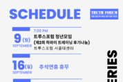 *트루스포럼 9월 일정 안내 9/9(월), 오후 7:00, 트루스포럼 서울대센터 트루스포럼 청년모임 (제2회 트루스포럼 하와이 트레이닝 후기나눔) 9/16 (월) 추석연휴 휴무 9/23(월), 오후 7:00, 트루스포럼 서울대센터 미국 내 종북세력의 실태 (로렌스펙) 9/28(토), 오후 4:00, 서울대 우석경제관 트루스포럼 강연 9/30(월), 오후 7:00, 트루스포럼 서울대센터 제주4.3특강2 (김은구 대표) *트루스 서포터즈 천만클럽 모집 안내 트루스포럼이 월 천만원 운영비 확보를 목표로 월 1만원 정기후원자 천명을 모집합니다! 대학/청년들을 중심으로 자생적으로 시작된 대한민국 최초의 보수주의 청년조직 트루스포럼이 지속적으로 성장해 나갈 수 있도록 응원해 주세요! *정기후원 신청은 아래 링크를 클릭해 주세요 후원신청 *일시후원: 농협 301-02-18-2222-81 트루스포럼
