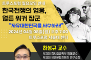 *트루스포럼 월요모임 안내 4월 둘째 주 모임은 하봉규 교수님의 강의로 진행됩니다. 월튼 워커 장군은 미국 정부가 남한을 포기하려던 찰나에 끝까지 싸워 낙동강 전선을 지켜낸 육군 영웅입니다. 우리가 잘 알고 있는 인천상륙작전이 성공할 수 있던 이유도 워커 장군이 목숨을 내걸고 부산 방어선을 끝까지 지키며 북한군을 묶어놓았기 때문입니다. 부경대 정치외교학부 명예교수로 계신 하봉규 교수님의 강의를 통해 워커 장군에 대해 자세히 배워보는 시간을 가졌으면 합니다. 일시 : 2024년 4월 8일 오후 7시 장소: 트루스포럼 서울대센터-대우디오슈페리움 2단지 410호 *트루스 서포터즈 천만클럽 모집 안내 트루스포럼이 월 천만원 운영비 확보를 목표로 월 1만원 정기후원자 천명을 모집합니다! 대학/청년들을 중심으로 자생적으로 시작된 대한민국 최초의 보수주의 청년조직 트루스포럼이 지속적으로 성장해 나갈 수 있도록 응원해 주세요! *일시후원 : 농협 301-02-18-2222-81 트루스포럼 *정기후원 신청은 아래 링크를 클릭해 주세요 www.트루스포럼후원.com