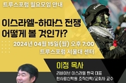 4월 15일 월요모임 안내 주제 : 이스라엘-하마스 전쟁 어떻게 볼 것인가? 강사 : 이정 대표 (리바이브 이스라엘) 장소 : 트루스포럼 서울대센터 4월 15일 월요모임은 리바이브 이스라엘 한국 대표이신 이정 목사님의 강연으로, '이스라엘-하마스 전쟁 어떻게 볼 것인가?' 라는 주제로 진행됩니다. 수십 년 전부터 지속되어 왔던 이스라엘과 팔레스타인의 역사, 극단무장단체 하마스의 의한 인권 유린의 실상에 대해 배워볼 수 있는 좋은 기회입니다. 많은 참여 부탁드립니다. *오시는 길 *트루스 서포터즈 천만클럽 모집 안내 트루스포럼이 월 천만원 운영비 확보를 목표로 월 1만원 정기후원자 천명을 모집합니다! 대학/청년들을 중심으로 자생적으로 시작된 대한민국 최초의 보수주의 청년조직 트루스포럼이 지속적으로 성장해 나갈 수 있도록 응원해 주세요! *일시후원 : 농협 301-02-18-2222-81 트루스포럼 *정기후원 신청은 아래 링크를 클릭해 주세요