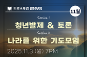 [트루스포럼 월요모임 안내] 돌아오는 주 월요일(11월 3일) 저녁에는 청년발제와 기도모임으로 진행합니다 :) 하나님의 말씀에 기반해 한국사회를 근본적으로 회복하고, 북한을 해방하며, 자유주의 신학으로 왜곡된 복음을 바로잡고 세계의 교회를 건강하게 다시 세워내는 것이 하나님의 기적으로 시작하고 성장한 대한민국의 궁극적인 사명입니다. 그렇기 때문에 우리의 활동은 기도 없이 이뤄질 수 없습니다. 트루스포럼은 종교단체는 아닙니다. 신앙이 다른 분들도 함께하실 수 있습니다. 하지만 건강한 복음에 바탕을 둔 기도의 사람들이 모임의 중심을 잡고 나아가야 지속적으로 성장해 나아갈 수 있습니다. 이에 트루스포럼은 아래와 같은 주제를 두고 기도를 계속해 왔습니다. <트루스포럼의 기도주제> 1. 역사의 주인이신 하나님 2. 대한민국과 열방의 주인이신 하나님 3. 대학과 모든 학문의 주인이신 하나님 4. 이스라엘과 예루살렘을 위한 기도 5. 동성애, 이슬람, 자유주의 신학 6. 북한의 해방 7. 대한민국의 회복 8. 트루스포럼을 위한 기도 위의 기도제목을 두고 함께 기도하실 분들은 누구나 편하게 참석해 주세요! 일시: 2025년 11월 3일(월) 오후 7시 장소: 서
