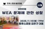 [트루스포럼 월요모임 안내] 돌아오는 주 월요일(11월 10일) 저녁에는 트루스포럼 김은구 대표의 강연으로 진행합니다! 주제: WEA 문제에 관한 성찰 일시: 2025년 11월 10일(월) 오후 7시 장소: 서울대 트루스포럼 센터 (서울 관악구 관악로 168) 항상 함께 해주셔서 감사합니다!♥️ 트루스포럼 사무국 <오시는 길>