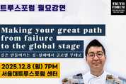 [트루스포럼 월요모임 안내] 돌아오는 주 월요일(12월 8일) 저녁에는에이징테크 연구소 김정현 대표의 강연으로 진행됩니다! 스타트업 현장에서 겪은 시행착오와 실패를 어떻게 디딤돌로 삼아 글로벌 무대로 나아갔는지 생생한 이야기를 들려주실 예정입니다. 관심 있는 모든 분들을 환영합니다! 주제: Making your great path from failure to the global stage (길은 만들어가는 것 – 실패에서 글로벌 무대로) 강사: 김정현 대표 (에이징테크 연구소)- 시니어 푸드테크 대상 수상- 인지케어 유산균 요거트 개발 일시: 2025년 12월 8일(월) 오후 7시 장소: 서울대 트루스포럼 센터 (서울 관악구 관악로 168, 대우디오슈페리움 2단지 410호) 항상 함께 해주셔서 감사합니다! ♥️ 트루스포럼 사무국