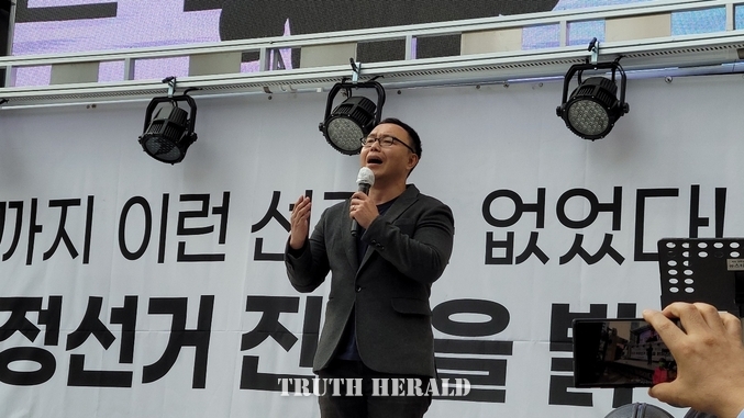 지난 6일 강남역에서 개최된 '4.15부정선거 진실을 밝혀라' 집회에서 트루스포럼 김은구 대표가 연단에 올라 연설하고 있다.