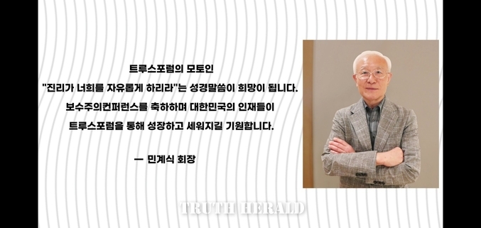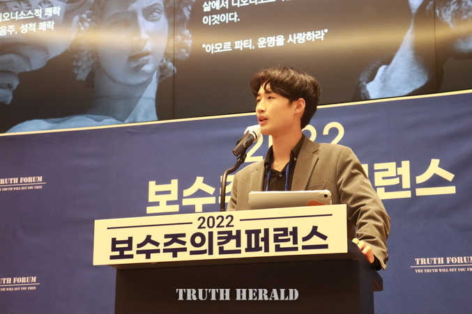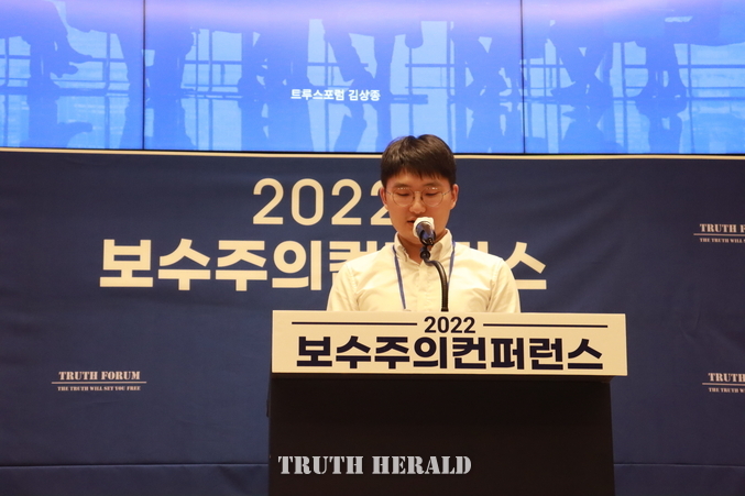 최근에 보수주의를 표방하는 연사들이 나타나면서 보수주의라는 말이 우리 주변에도 많이 언급되고 있는 것 같습니다. 그런데 미국 대학에서는 나는 보수주의자 라고 말하면 그것만으로도 공격당하는 소재가 되기도 합니다. 트루스포럼도 대학 내에서 보수주의를 표방하고 있는데 저희를 극우로 매도하고 있어, 대학내 동아리 등록도 못하고 있는 너무도 안타까운 현실이라고 말했다. 대한민국에서도 보수주의를 말하는 것이 쉽지않은 환경인데도 불구하고 보수주의 컨퍼런스 2022에 와 주신 한 분 한 분에게 감사의 말씀을 드린다고 인사했다.