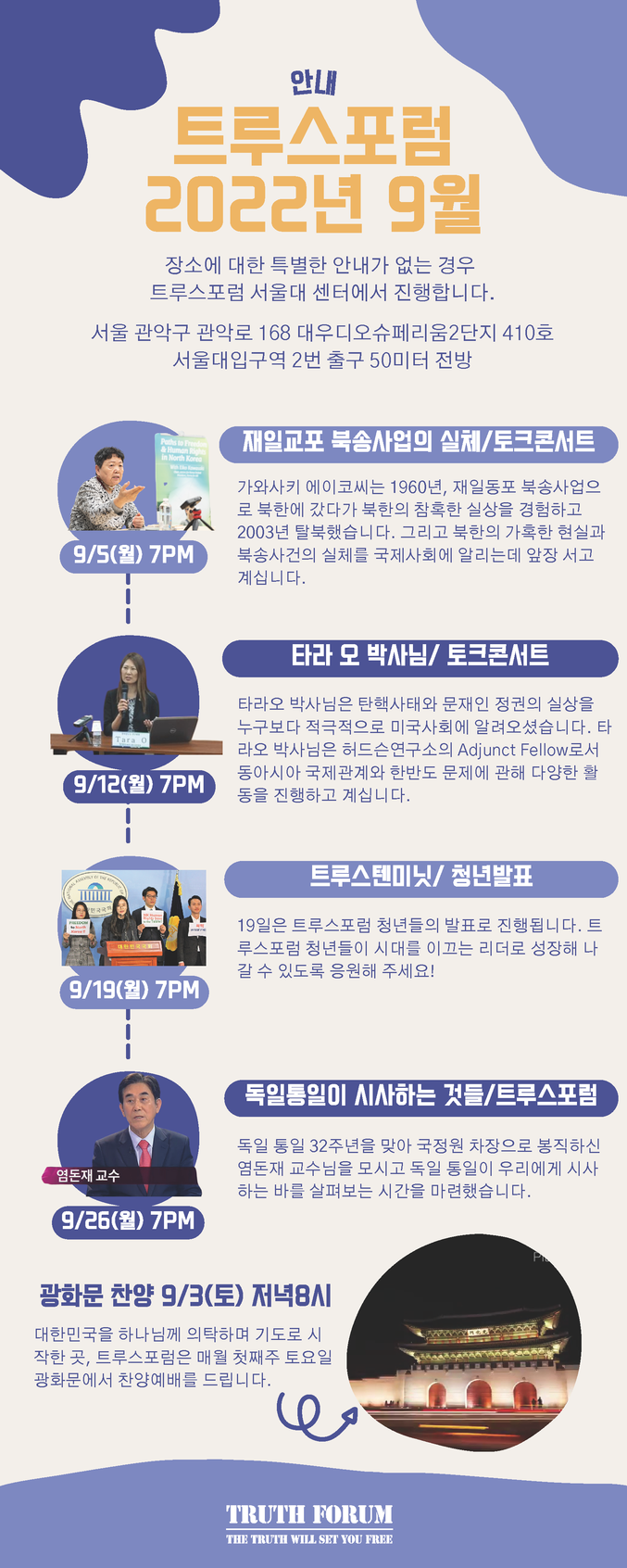 아울러 트루스포럼의 2022년 9월 활동 계획을 안내해 드립니다.