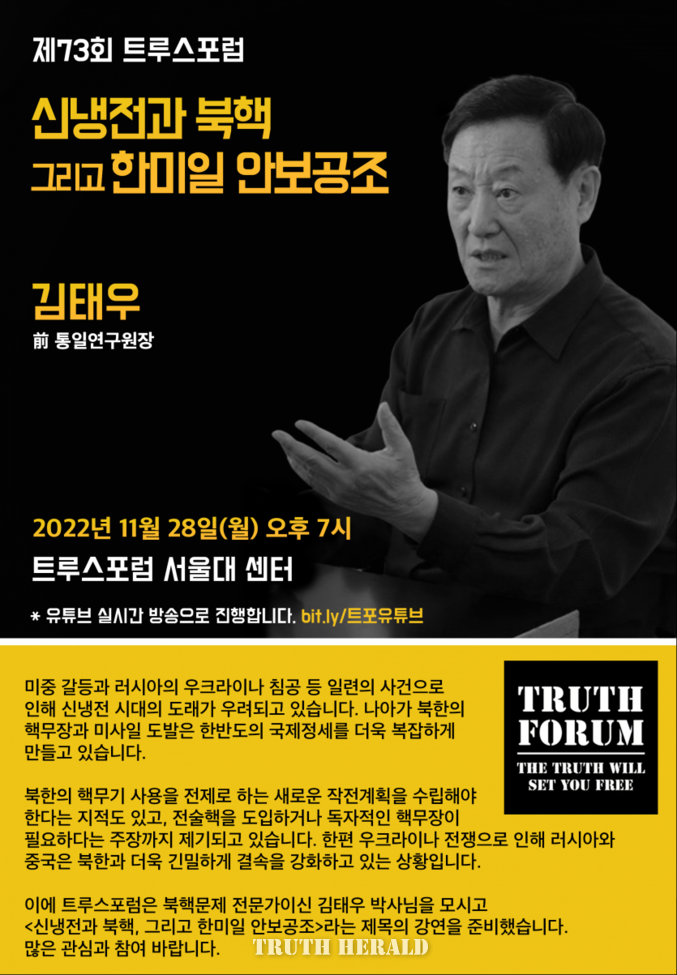 이에 트루스포럼은 북핵문제 전문가이신 김태우 박사님을 모시고 <신냉전과 북핵, 그리고 한미일 안보공조>라는 제목의 강연을 준비했습니다.