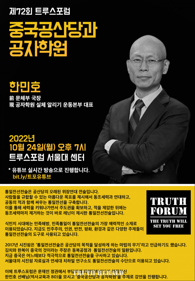 이에 트루스포럼은 문재인 정권에서 부당하게 파면당하셨다가 복직하신 한민호 선배님(역사교육과 80)을 모시고 '중국공산당과 공자학원'을 주제로 강연을 진행합니다.