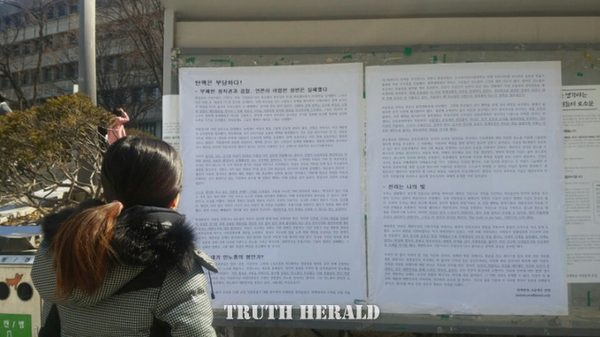학생회관엔 민노총이 주도한 11월 12일 민중총궐기 대형 현수막이 오랫동안 걸려있었다. 탄핵정국이 시작될 무렵 서울대 8000인이 탄핵을 지지한다는 성명이 발표되었고, 스누라이프(서울대학교 학생 커뮤니티)엔 부끄러운 동문상 투표가 올라와 특정 인사들을 조롱했다. 총학생회에서 외치는 구호들은 민노총의 그것과 별반 다르지 않다. 총학은 민노총이 주도하는 촛불집회 참여를 계속 독려한다. 무엇이 진실인지 깊은 성찰 없이 기성 운동권의 정치선동을 앵무새처럼 반복하며 이용당한다. 학생 운동권은 학생사회의 의견을 반영하지 못한다. 정치적으로 편향된 일부의 의견이 대학 전체 의견인 양 이용되고 있다. 서울대가 왜 민노총의 나팔수로 전락해야 하는가! 총학은 앵무새인가!