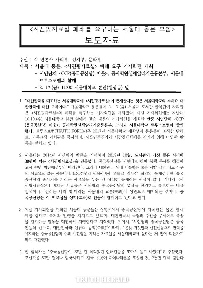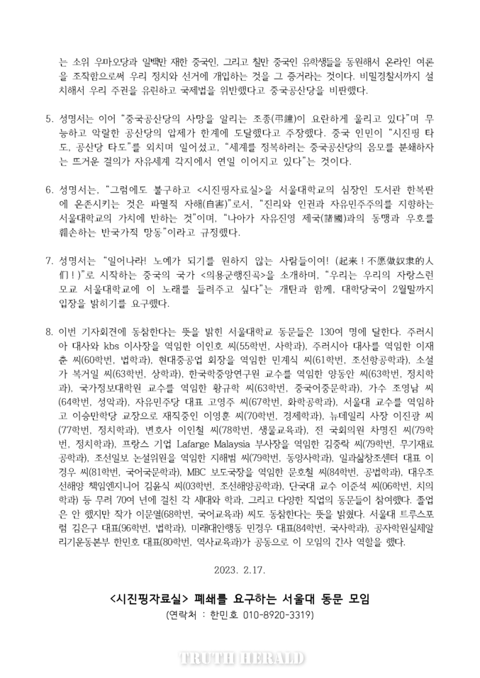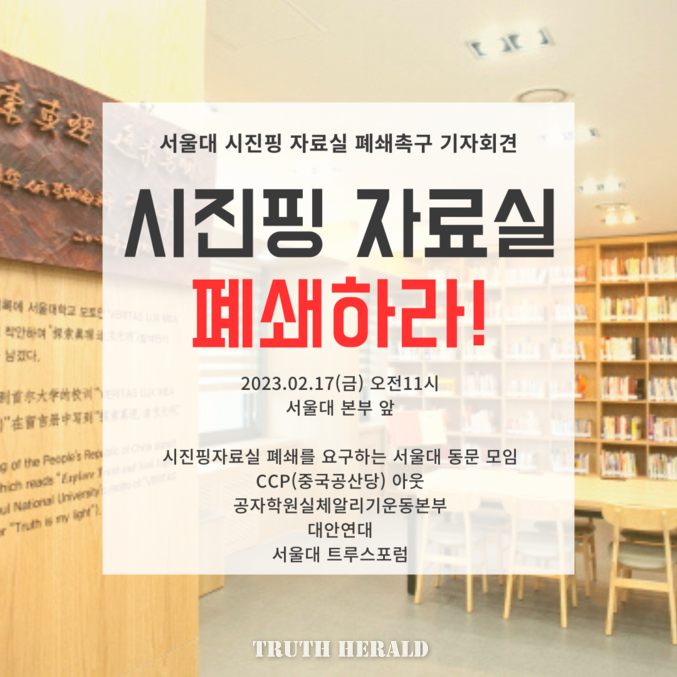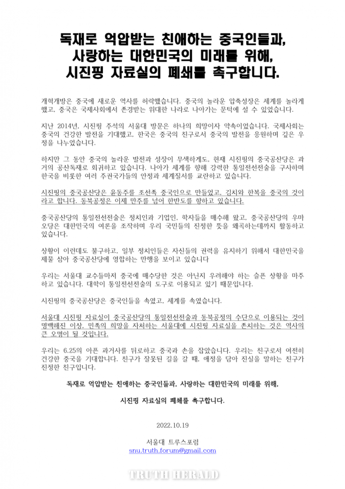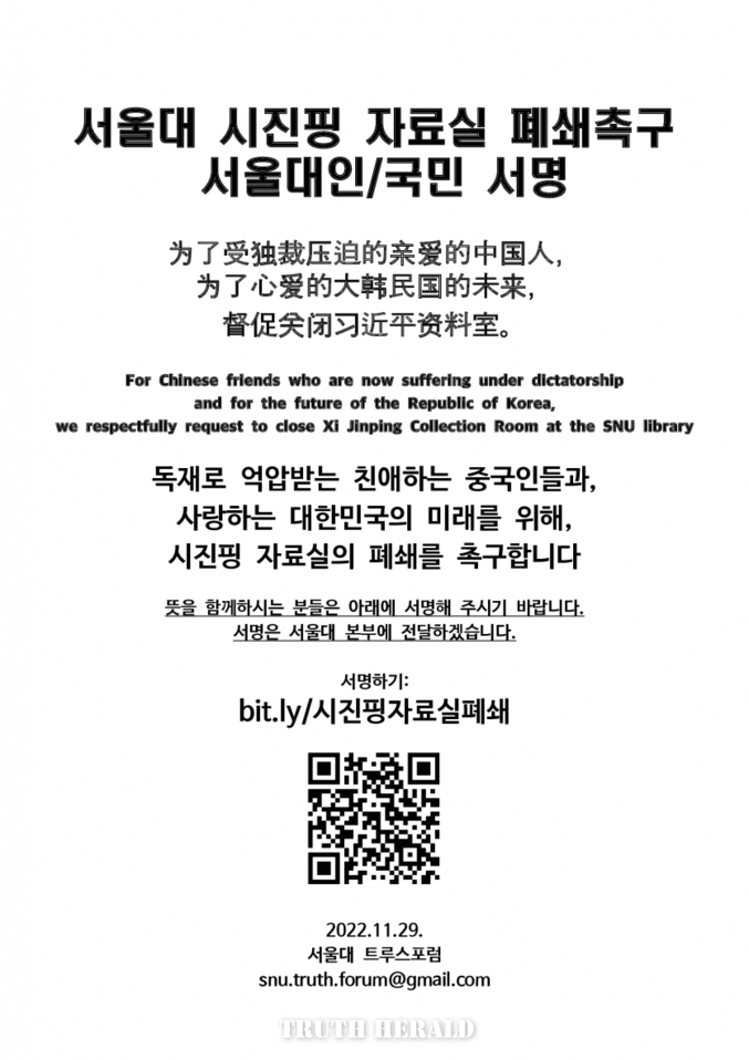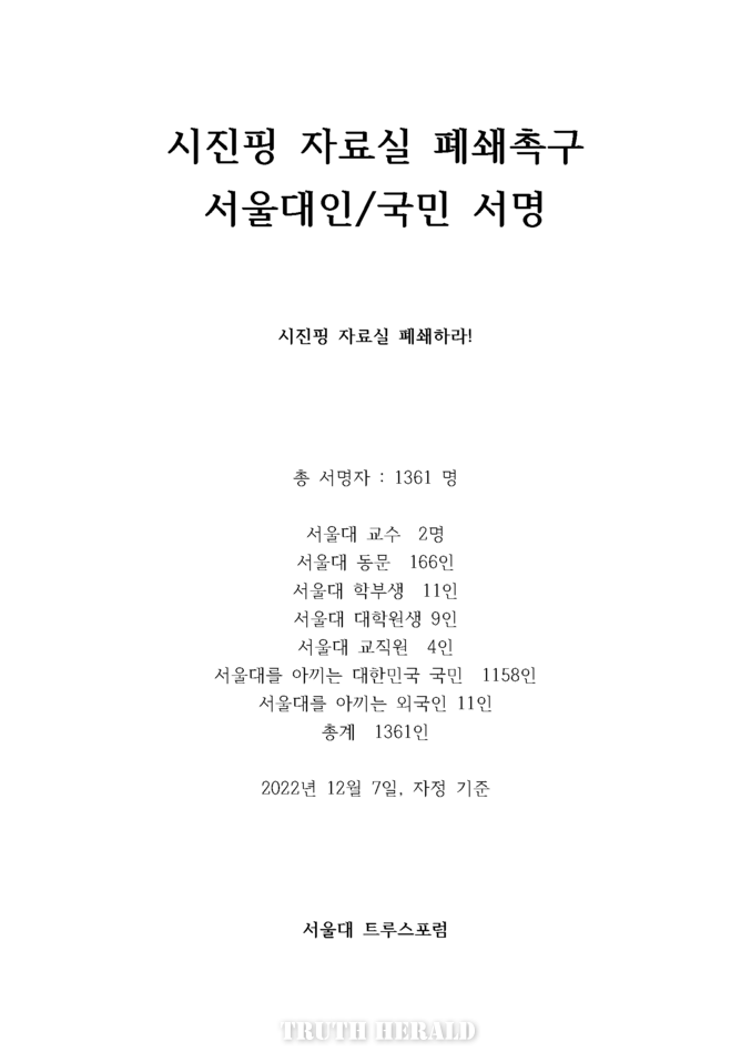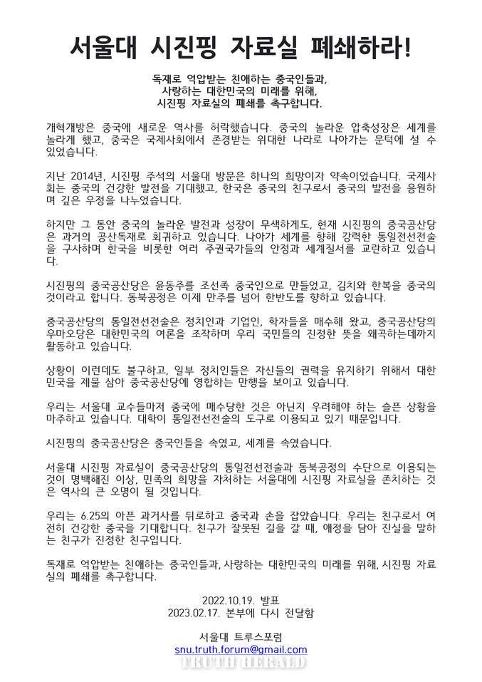 트루스포럼이 진행하고 있는 "서울대 시진핑 자료실 폐쇄촉구 서울대인/국민 서명"은 시진핑 자료실이 폐쇄될 때까지 계속 진행합니다.