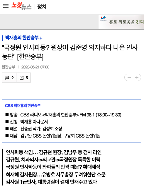 =두 번째로 이번 인사파동의 좀 먼 원인 왜 이런 일이 있었는지 지금 현재 이번 달이 아니고 한 몇 달 전, 한 반 년 전에 있었던 일에 대해서 잠깐 얘기 말씀드리겠다. 당시 조상준 기조실장이 지난 연말 갑작스럽게 퇴사했는데 그때 조상준 실장과 김규현 원장 간에 심각한 어떤 갈등이 있었다. 그래서 그 갈등을 해결할 수 없는 수준으로까지 격화됐기 때문에 결국 조 실장이 옷을 벗고 조 실장과 김 원장 사이에 메신저 역할을 했던 김모 비서실장이 비서실장직을 그만두고 새로 창설되는 방첩센터장으로 가는 것 그걸로 해서 당시 일단락된 적이 있다.